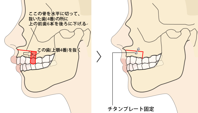 上アゴの4番という歯を抜いて後で、前歯の6本の部分を骨ごとフリーにして、まるごと後ろに下げて留めるという手術です。